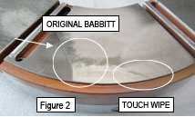 Figure 4 shows a closer view of the pitted marks. Note how they appear frosted. The babbitt is nearly gone at the trailing edge of the shoe as shown in Figure 5.