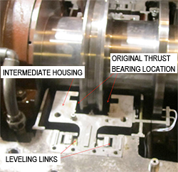 The original thrust bearing was a unique design consisting of symmetrical taper land thrust plates enclosed in a floating housing. The outer diameter of the bearing housing included a large axially centered flange that engaged leveling links mounted in the turbine housing.