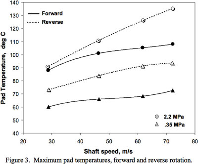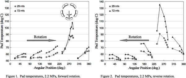 Some common trends for forward and reverse rotation can be ascertained from Figures 1 and 2. The temperatures of every pad increase in direction of rotation and with speed. It is noted that the loaded pad temperatures increase in direction of rotation to a maximum and then decrease to a lower level towards the trailing edge. The decrease is more dramatic in the case of reverse rotation. It is also noted that reverse rotation maximum temperatures are much hotter, reaching 136 °C compared to 109 °C for forward rotation at the most extreme conditions tested. Figure 3 compares maximum measured temperatures for various operating conditions. Reverse rotation maximum temperatures ran 1 to 27 °C hotter depending on operating conditions. The pad surfaces were examined after tests and found to be in excellent condition, with no wipes or any indications of distress.