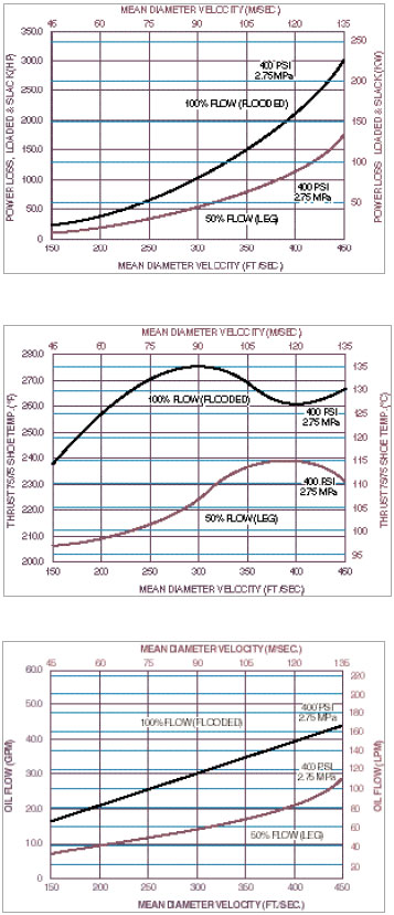 Power loss is lower than both flooded and spray feed bearings due to the elimination of parasitic losses. The flow of cool oil over the leading edge lowers shoe surface temperatures, increasing the LEG bearing's capacity. The resulting performance improvements are shown in these graphs.