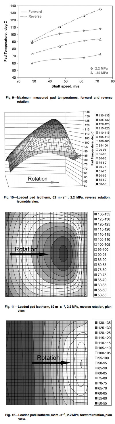 Babbitt temperatures in pivoted shoe bearings can be significantly reduced by offsetting the pad pivots in the direction of rotation. However, reverse rotation can occur in certain types of machinery under temporary or adverse conditions. The offset is then in the wrong direction and it becomes important to know if the bearing can withstand the reverse rotation operating conditions without damage. This paper compares pad temperature data from tests of a 152.4-mm, 60 percent offset bearing in forward and reverse rotation. The data indicate that the offset pivot bearing can run in reverse without damage for the operating conditions tested. Reverse rotation pad temperatures are hotter. Discussions towards the end of the paper address assessment of the data.